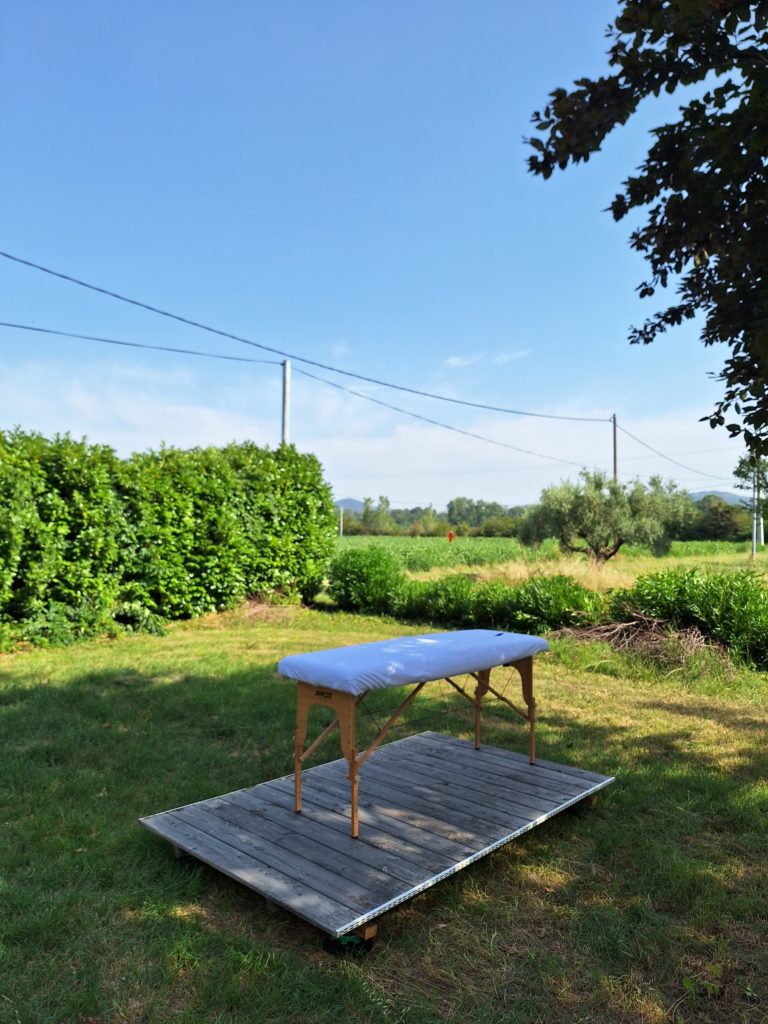 Je masse, en extérieur prés de Montélimar (Drôme) dans un parc ombragé pour une détente optimale.
